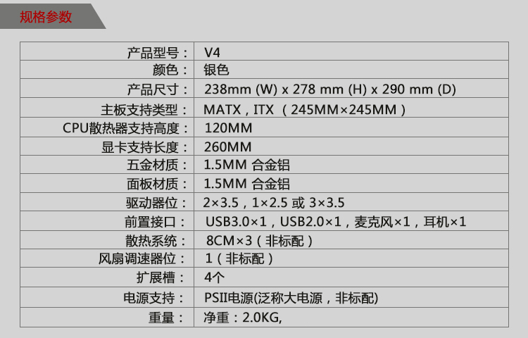 商品名称:乔思伯(JONSBO)台式机组装电脑机箱 全铝合金外壳/ATX电源 V4银色MATX机箱